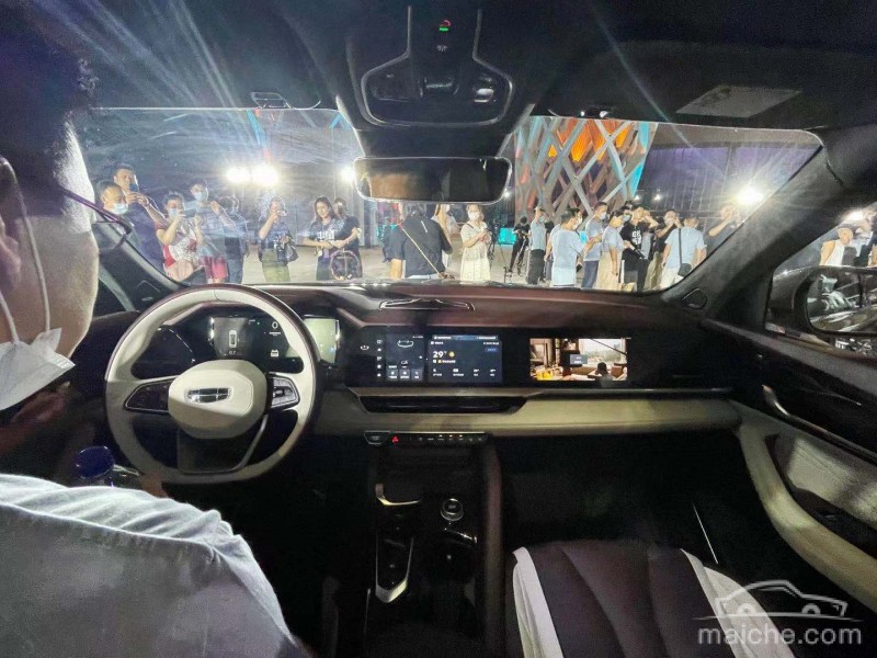 新车内饰采用双色搭配风格,在保证质感的同时提升设计韵味,整齐的缝线工艺与细腻的材质用料尽显与众不同。此外,横跨中控台的三联屏也是新车的亮点之一,官方号称是“视界画卷”IMAX屏,颇有些新造车企热衷的简约大气、但不失豪华的科技感。